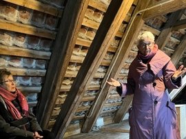 Tuula var arrangør og havde inviteret os til Gilleleje Kirke hvor vi mødtes med vores guide Tove, som var en fantastisk fortæller. Meget af fortællingen handlede om Toves opvækst, som en af de mange "gemte" børn. Toves held var, at hun var lyshåret og lignede slet ikke en jøde, som generelt har mørkt hår.Toves mor flygtede til Sverige og Tove blev hos plejefamilien i Gilleleje. Da moren kom hjem og skulle hente sin datter som aftalt, havde Tove slet ikke lyst til at tage med sin mor. Tove var stærk og fik sin vilje og kom til at bo hos plejefamilien. Tove savnede sin far men fik ham ikke at se, da plejemoren forhindrede hende i at møde ham hele hendes liv. Tove arbejdede som fodterapeut på Bispebjerg Hospital hvor hun tilfældigvis mødte hendes far. Hun bad om at se han journal hvor hun læste at han kun ville have få uger tilbage at leve i. De sidste uger i farens live var hun sammen med ham hele tiden og han fik fortalt hende at han have opsøgt hende mange gange men plejemoren havde forhindret dem i at mødes. så kom vi op på loftet hvor 86 jøder sad under krigen for at komme til Sverige. Kun 2 undslap og Tove har talt med begge og fået deres historie.