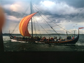 Så skulle vi til Roskilde igen, denne gang til Vikingeskibsmuseet. Vejret var dejligt så Kirene og Tuula slikkede lidt solskin inden vi gik ind i museet, hvor vi mødte vores guide Niclas. Nicklas var en rigtig "Viking", som bl.a. havde været ombord Havhingsten på rejsen til Dublin, en fantastisk tur med mange oplevelser. Niclas er forøvrigt arkæolog og havde selvfølgelig været med til udgravningen af skibene, som var sænket i Peberrenden, for at beskytte Roskilde. Man kunne ikke bare hive resterne op, så ville de smuldre helt væk, så man tørlagde hele området og alt blev lagt i en slags voks, så de brædder man kan se, består af ca. 20% træ og 80% voks. Alle stumper blev tegnet og nummereret (ca. 100.000 stk) og det har taget ca. 25 år at få samlet stumperne - det er godt vi er sådan et rigt land! Forøvrigt har kloge mennesker undersøgt selve museumsbygningen, som man regner med vil styrte sammen inden 7 - 8 år, hvis man ikke finder på et eller andet, og det er svært når den er fredet.