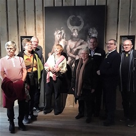 Jane stod for arrangementet. Hun synes det var på sin plads at støtte Nationalmuseet, Rana Willerslev og selvfølgelig Jim Lyngvig, som (gratis) havde sat sit præg på udstillingen om Vikingerne. Vores guide hed Maria, som var rigtig god og gav hurtige svar på vores spørgsmål. Vi så bl.a. runesten, som man idag er i stand til at læse. På en tavle kunne man se en oversættelse af runer til bogstaver. Bluetooth stammer f.eks. fra et runetegn (godt spottet af Preben). Vi så en masse fund af sølv og guld men det mest interessante var Jim's billeder med gæt på hvordan Vikingerne så ud og var klædt. Billedet af de nøgne vikinger med div. hovedbeklædninger bl.a. horn og dyrehover har været genstand for mange udtalelser, men flotte var de.